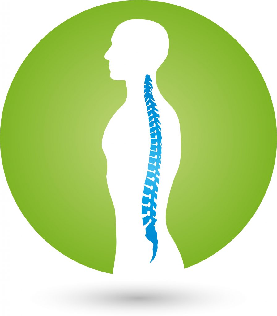 Das Bild zeigt eine weiße Kontur von einem Mann vor einem hellgrünen runden Hintergrund. Die Wirbelsäule wird in blau dargestellt